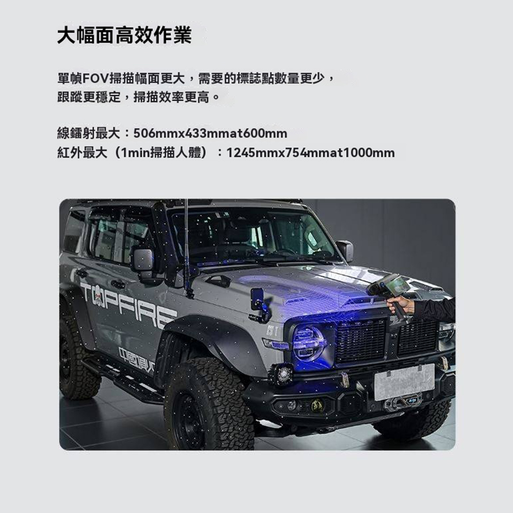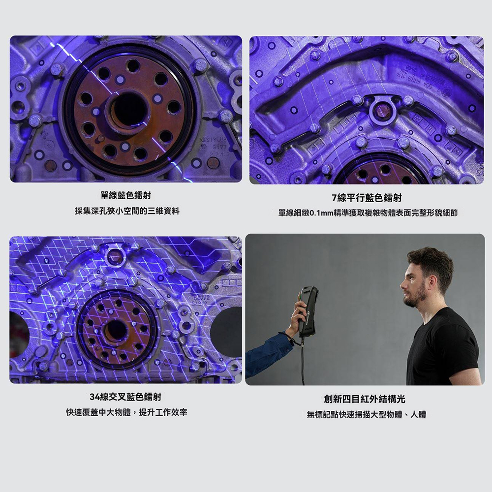 S1 擁有廣泛的掃描範圍,從最小 5×5×5mm 微小零件到 4 公尺大型物體都能輕鬆應對。再加上 NIR 模式的支援,讓戶外掃描、人體建模與複雜場景皆可順利完成。它同時具備 Marker-free 與 Spray-free 技術,免去繁瑣的前置處理,使用上更加直覺省時。
